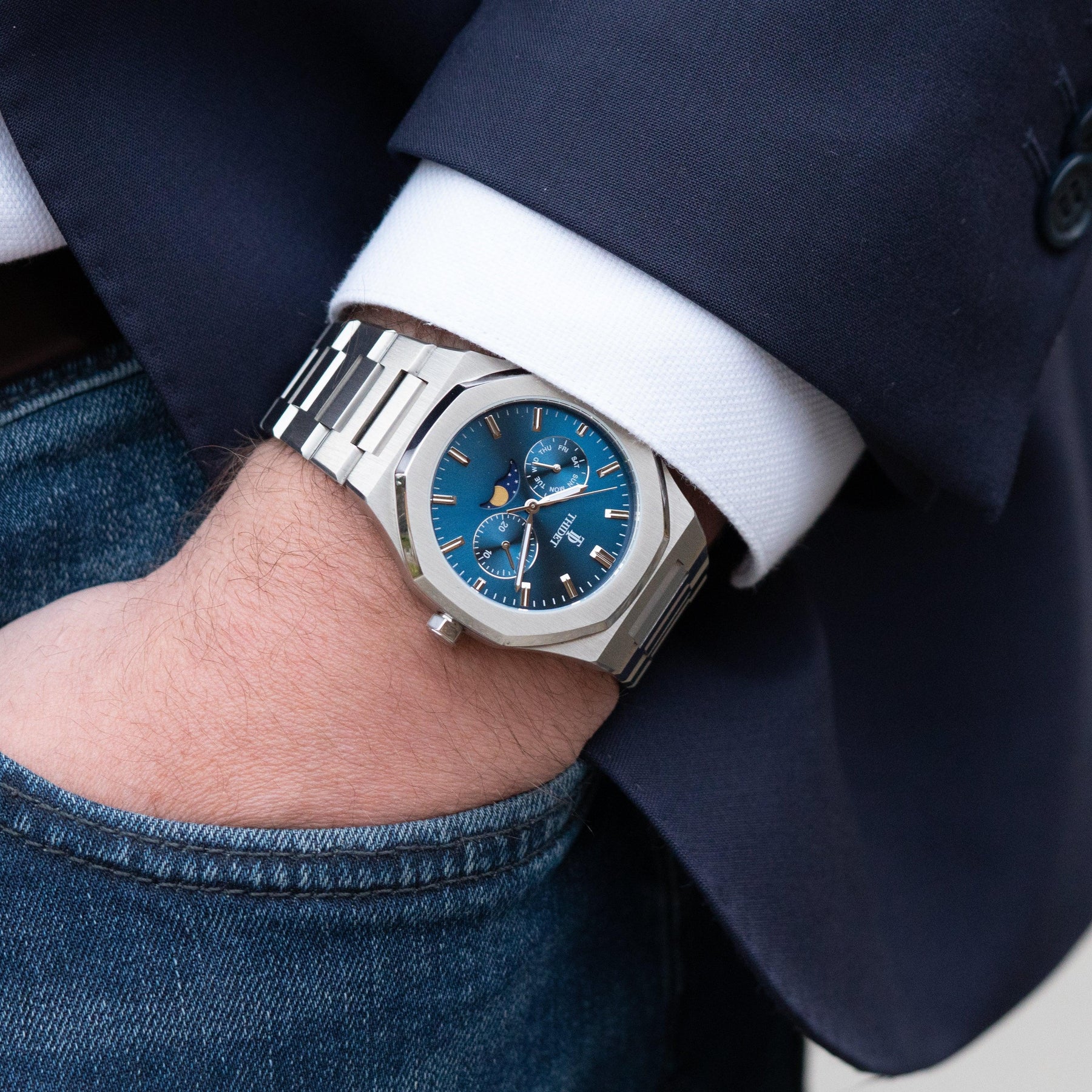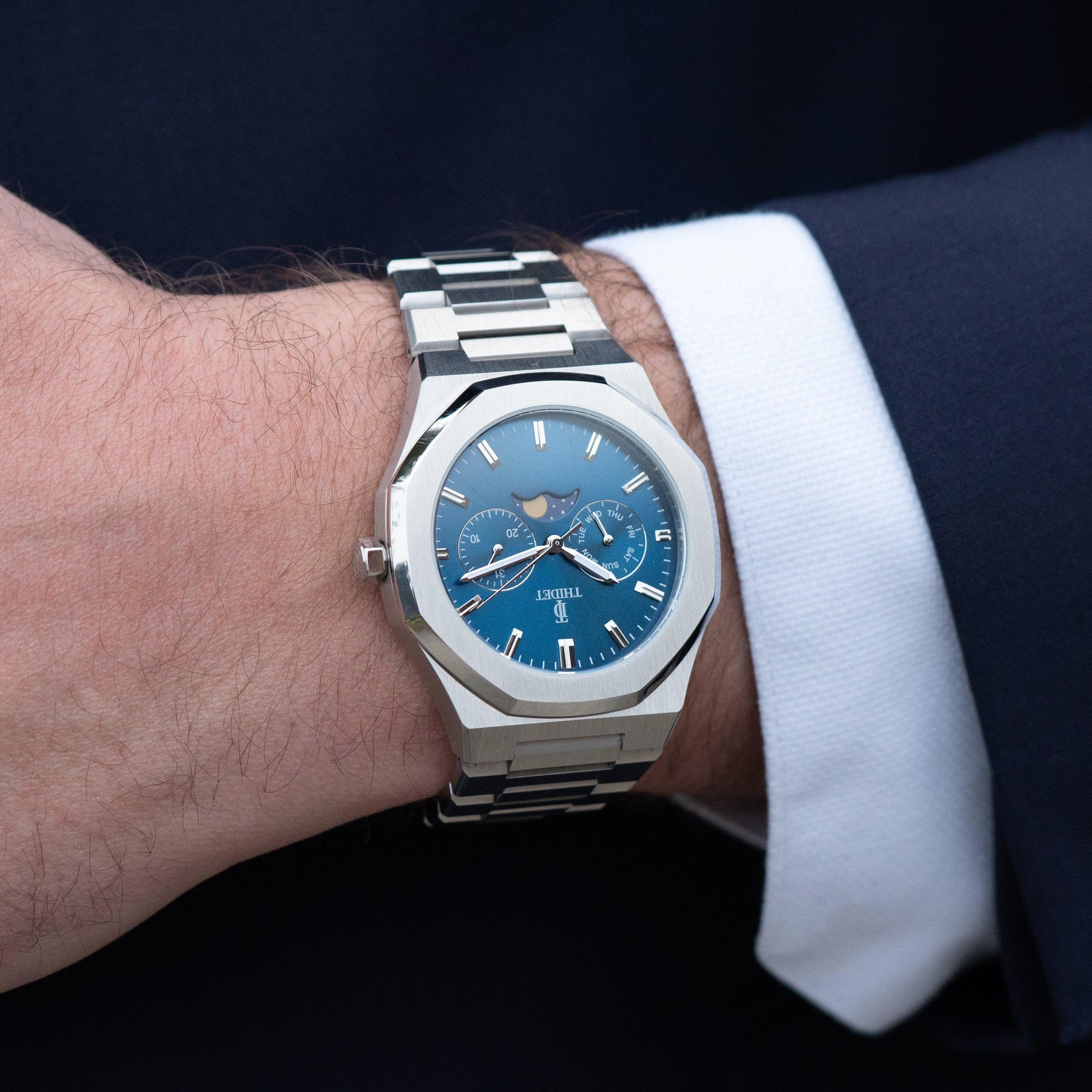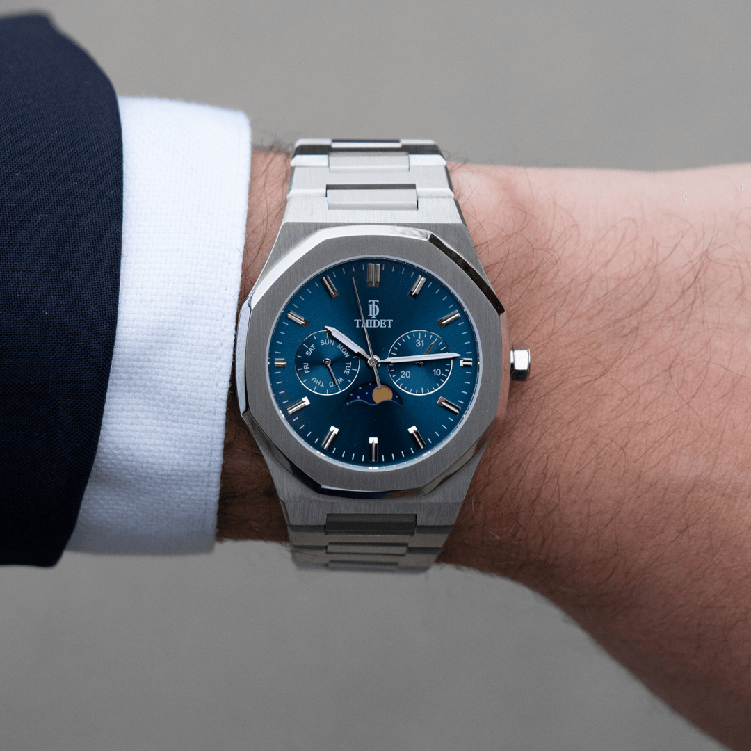 Son boîtier en acier inoxydable se distingue par des lignes pures et une finition soignée, soulignant son caractère contemporain. Avec un diamètre de 41 mm et une épaisseur contenue de 11 mm, elle allie équilibre esthétique et confort au poignet. Étanche à 5 ATM, elle s’adapte naturellement à un usage quotidien.